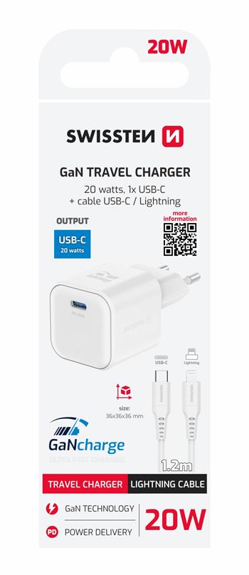 SWISSTEN SÍŤOVÝ ADAPTÉR GaN 1x USB-C 20W POWER DELIVERY BÍLÝ + DATOVÝ KABEL USB-C/LIGHTNING 1,2 M BÍLÝ